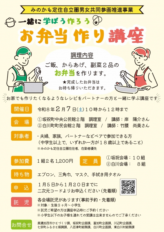 いっしょに学ぼう作ろう お弁当作り講座 お知らせ 投稿日:2026年01月05日 作成者:企画課 夫婦や家族、パートナーなどと一緒にお弁当作りを楽しみませんか? 料理初心者の方も大歓迎です。ぜひお気軽にご参加ください。 ▶お申し込みはこちら